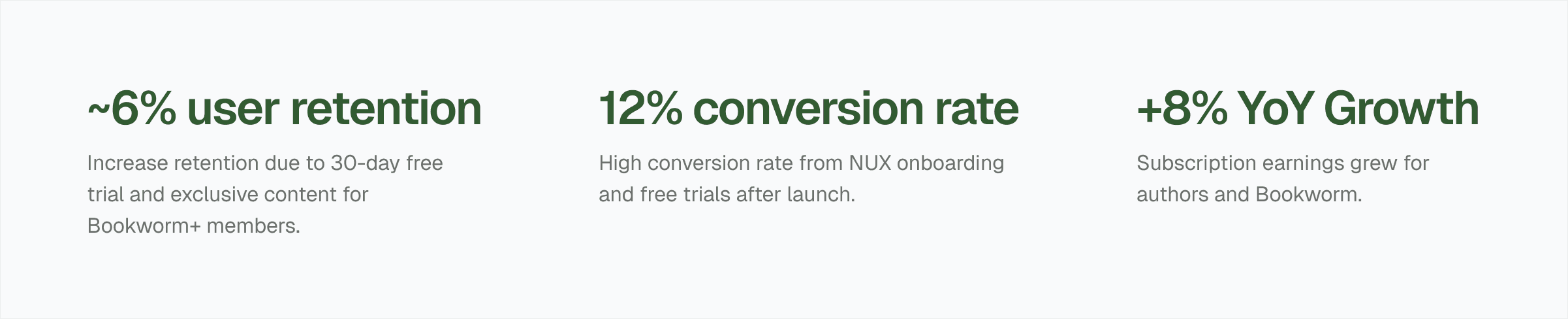 Bookworm KPIs to track its success — These metrics highlight the positive impact of Bookworm+ features, like exclusive content and onboarding, on user retention and conversion rates, contributing to a steady year-over-year growth.