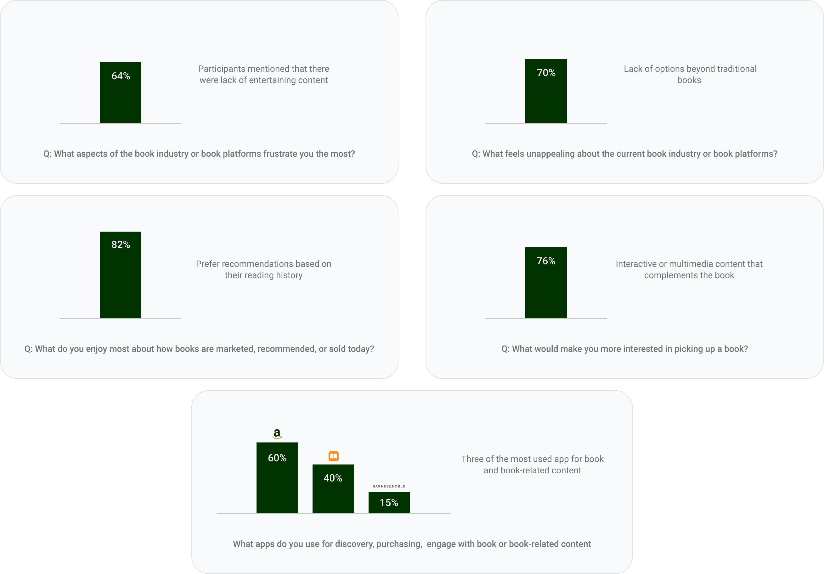 I conducted 10 interviews between the ages of 20 and 35 of 50% book readers and 50% non-book readers to understand current app usage and uncover gaps in user interest. Users find the entertainment value of current book apps lacking, making it challenging for both groups to stay engaged.