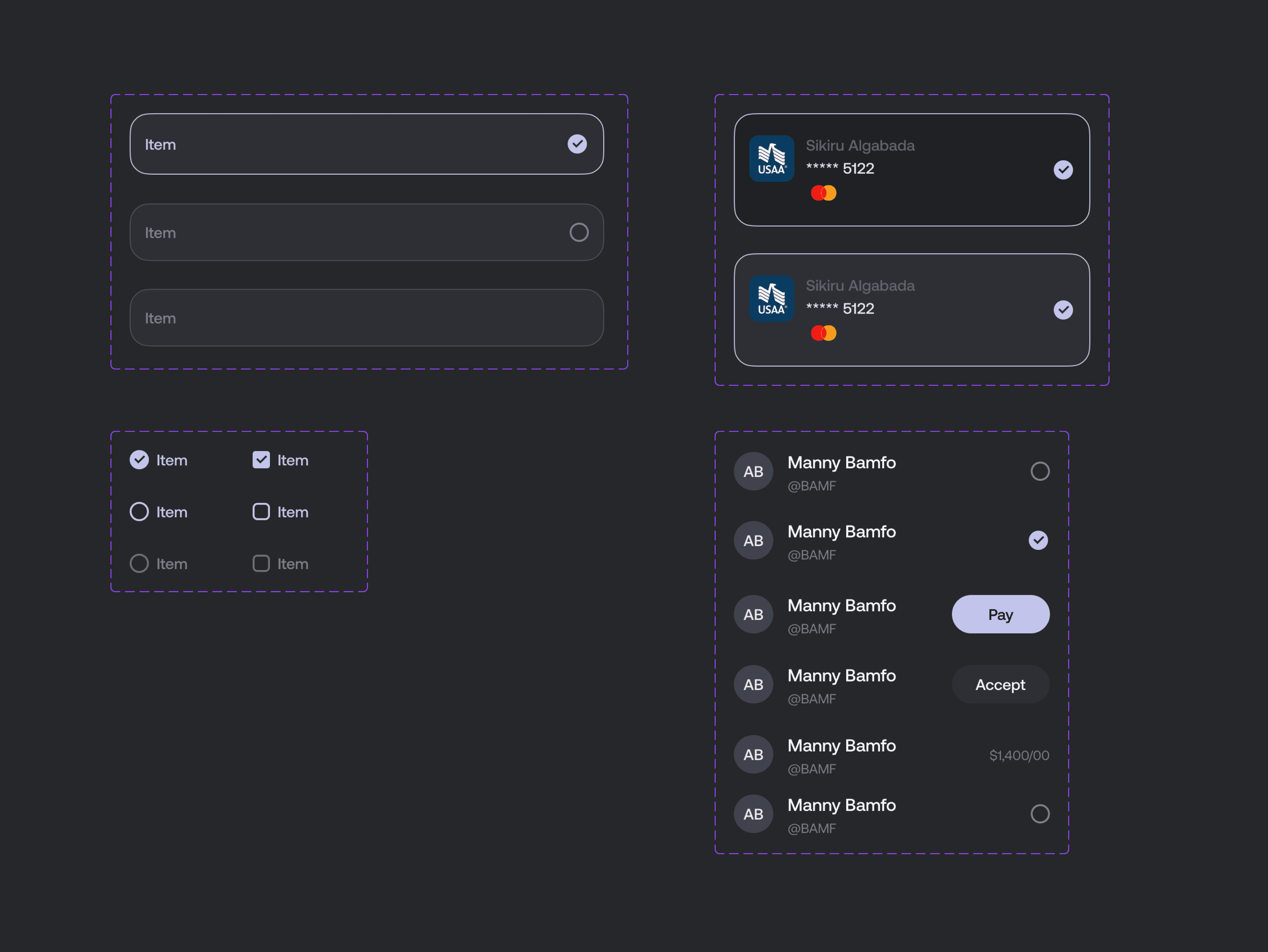 List-based components supported key user flows like selecting payment methods, choosing contacts, and making quick decisions using checkboxes or radio buttons. The goal was to make each action feel simple and intuitive, while still being functional and accessible across different screens.