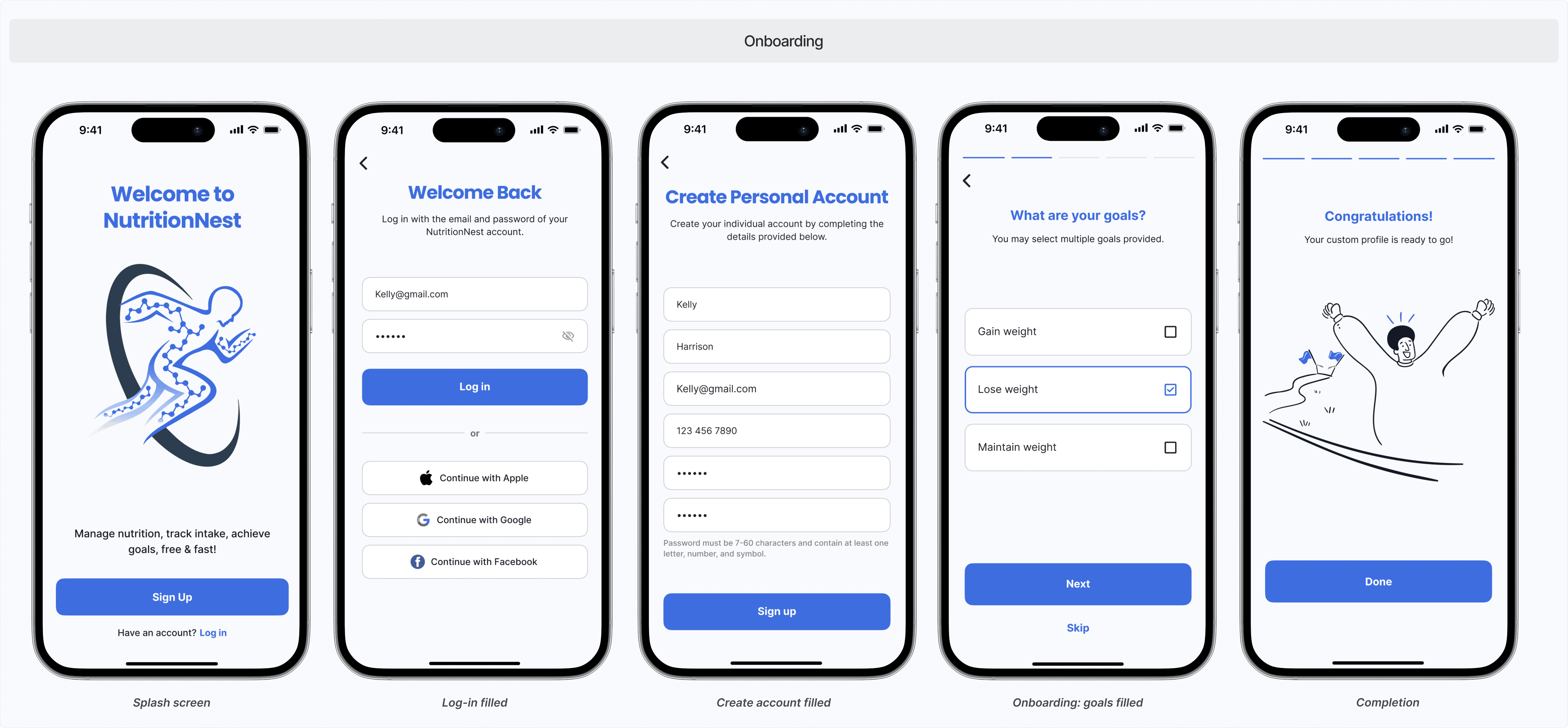 In our onboarding stage, users are greeted with a splash screen introduction along with log-in/sign-up, short 6-part questionnaire for a tailored, and final confirmation.