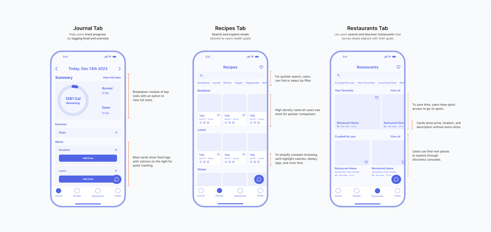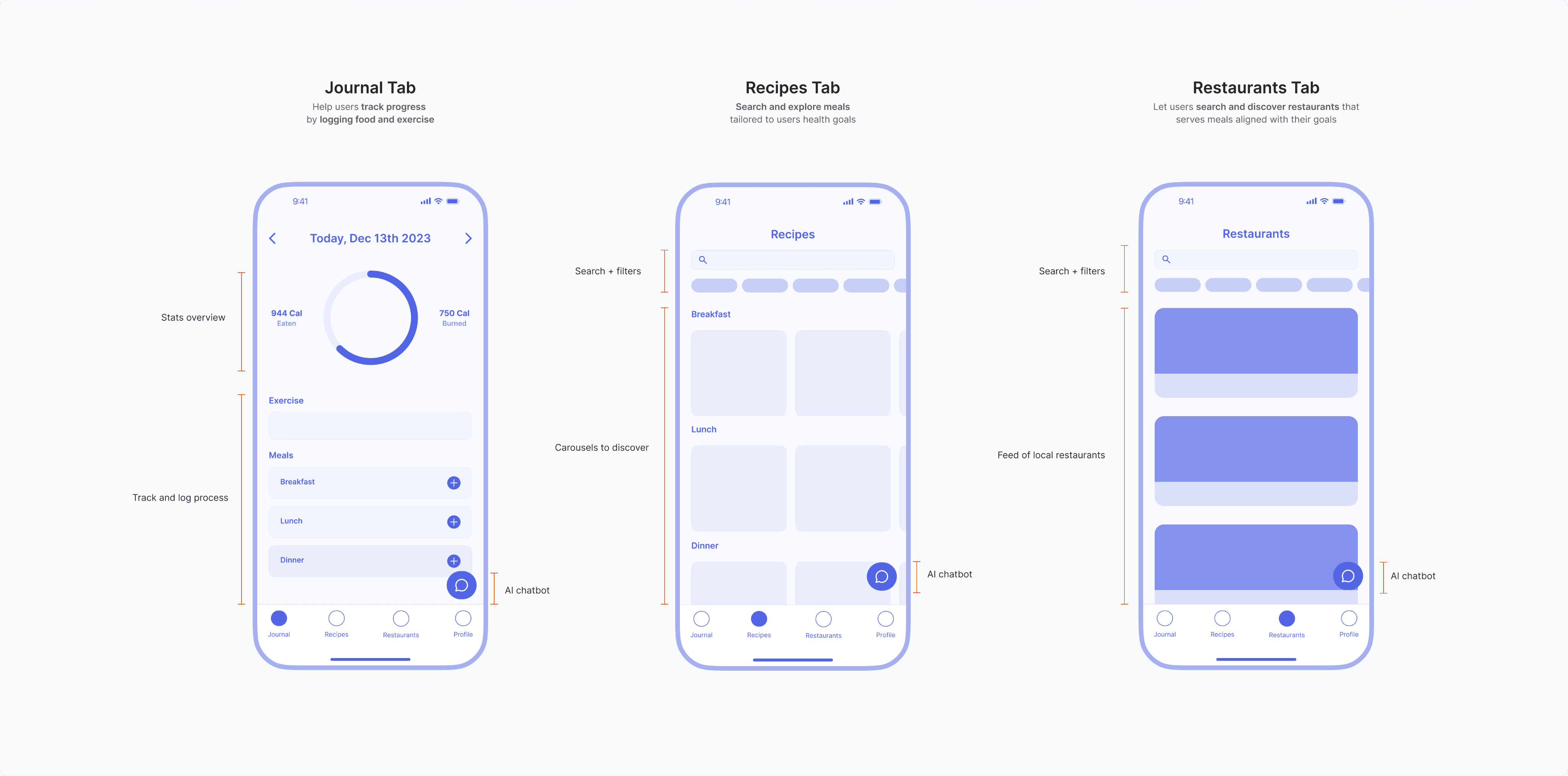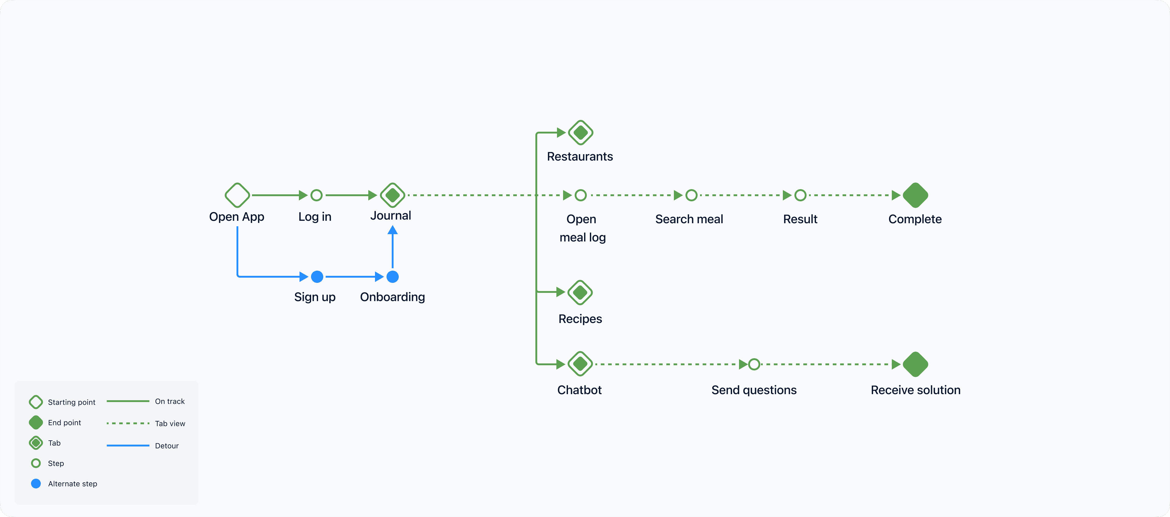 After aligning our goals, I mapped out a user flow to identify bottlenecks and key screens, such as an AI chatbot for personalized support, restaurant listings for healthier dining, a recipes for meal planning, and a user journal for tracking progress.
