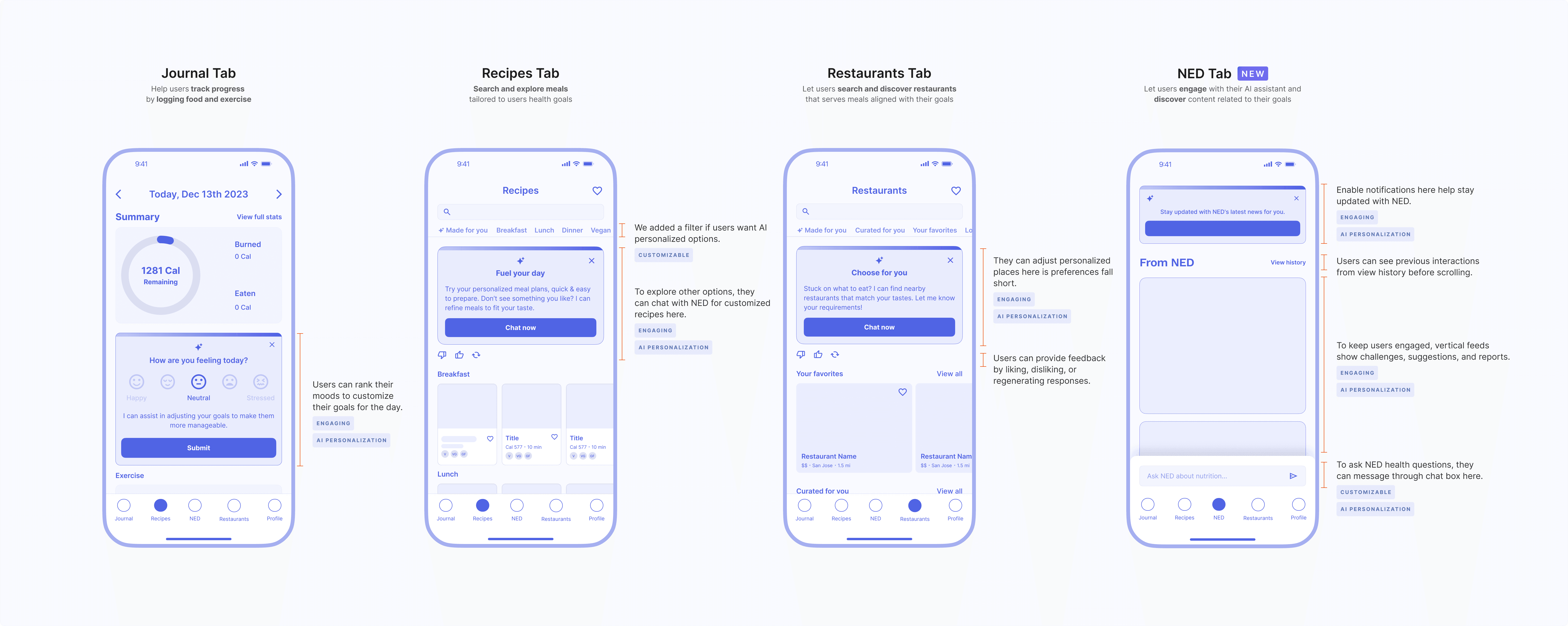 The final design circles back to its core mission providing a customizable and engaging design approach. From onboarding to finding recipes and restaurants, everything adapts to their preferences. NED cards keep users engaged with quick, AI-powered tips and calorie adjustments that fit their daily needs.