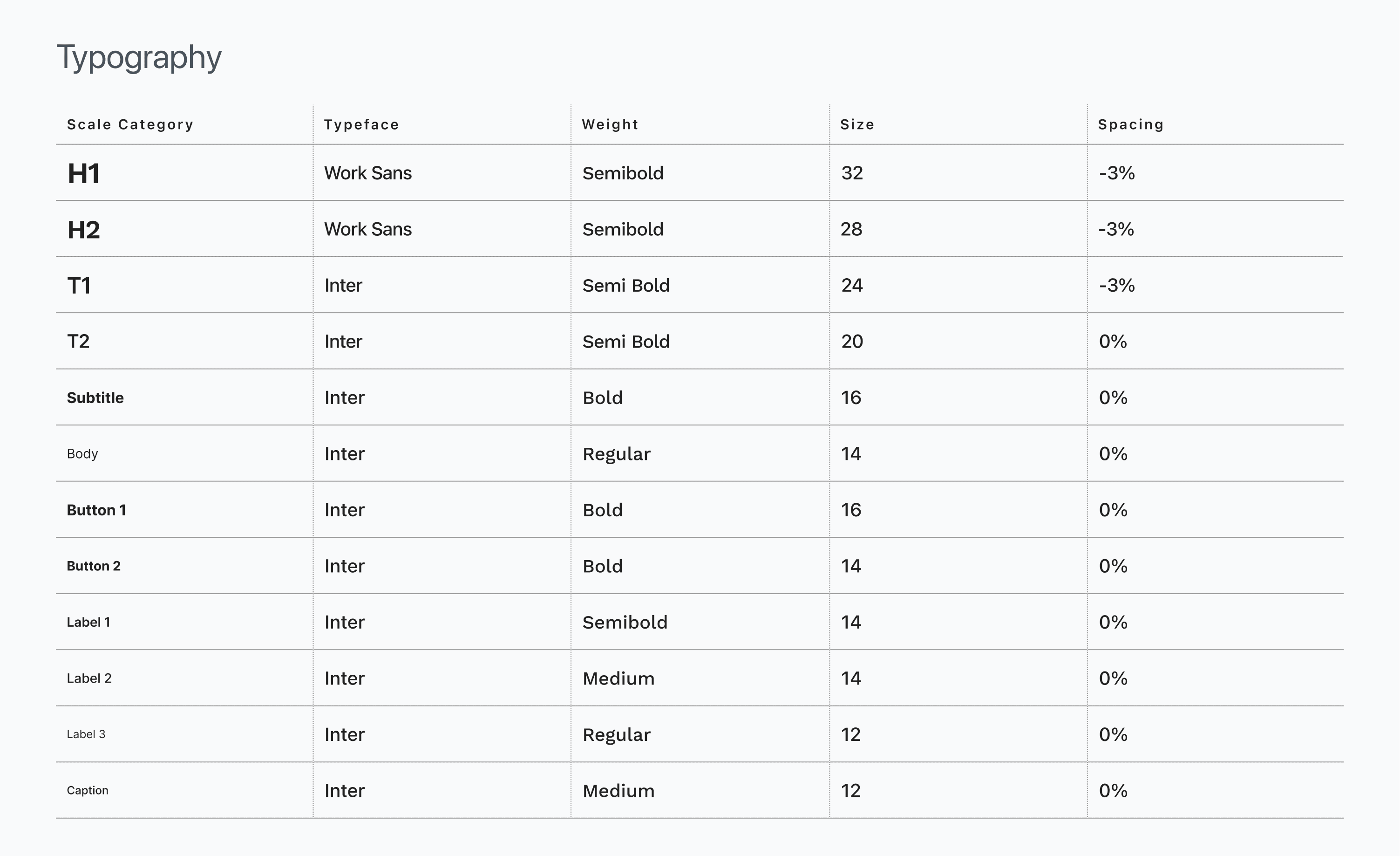 Work Sans is used for headers and expressive moments, ideal for quick readability. To contrast, I used Inter that's versatile for body text and product copy which seamlessly fits into the design.