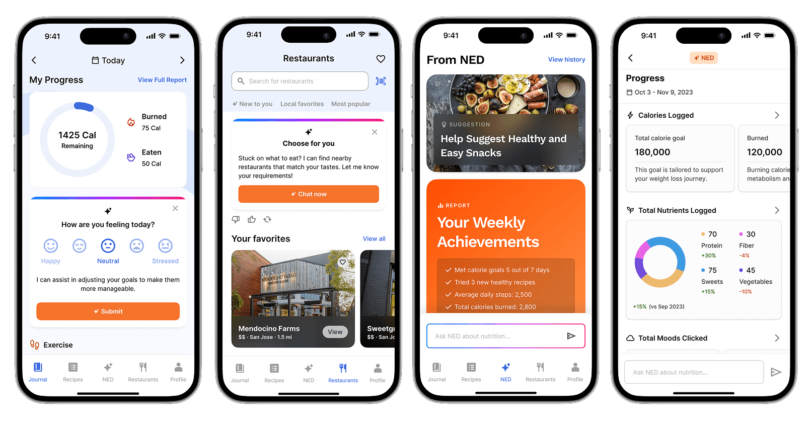 Refined flow from journal, recipes, restaurants with NED fully integrated to provide personalized, nutritionist-like guidance. A dedicated NED tab delivers news, challenges, and real-time updates to stay informed and engaged.