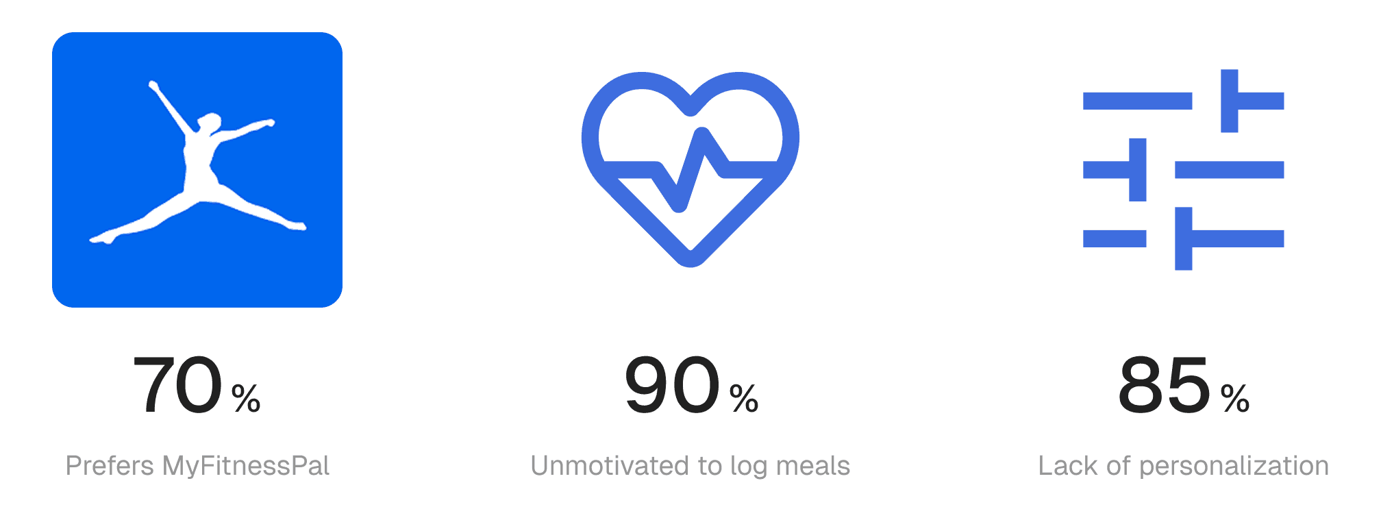 I first ran online surveys on platforms like Subreddits, Facebook groups, Slack forums, and my professional network, focusing on users’ health challenges and obstacles. From 30+ responses, I found that users often struggle to stay motivated, which led to inconsistent use and setbacks in their health goals.