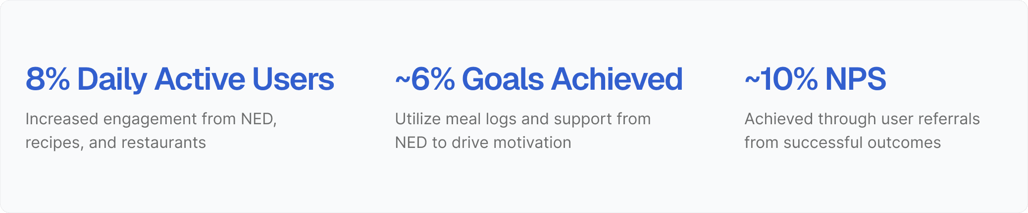Our team’s success metric for daily active user rate, increased goal achievement with NED’s support, and NPS driven by user referrals highlight the positive impact on engagement and motivation.