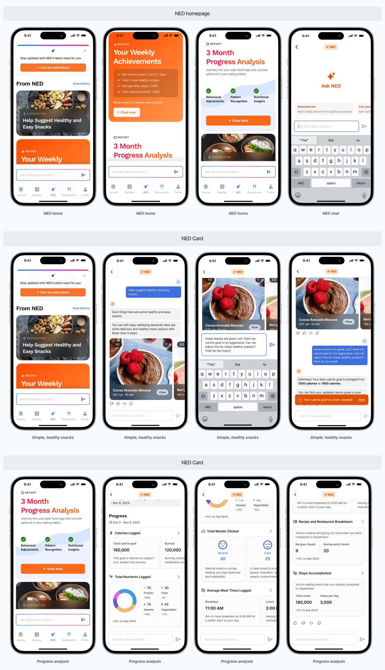 The NED page features a clean design with scrollable feeds that make it easy to dive into nutritional chats. We'll get inside look on three distinct NED cards highlighting simple, healthy snacks, 1-week of keto meals, and progress analysis. NED is here to support by boosting motivation and providing customizable features.