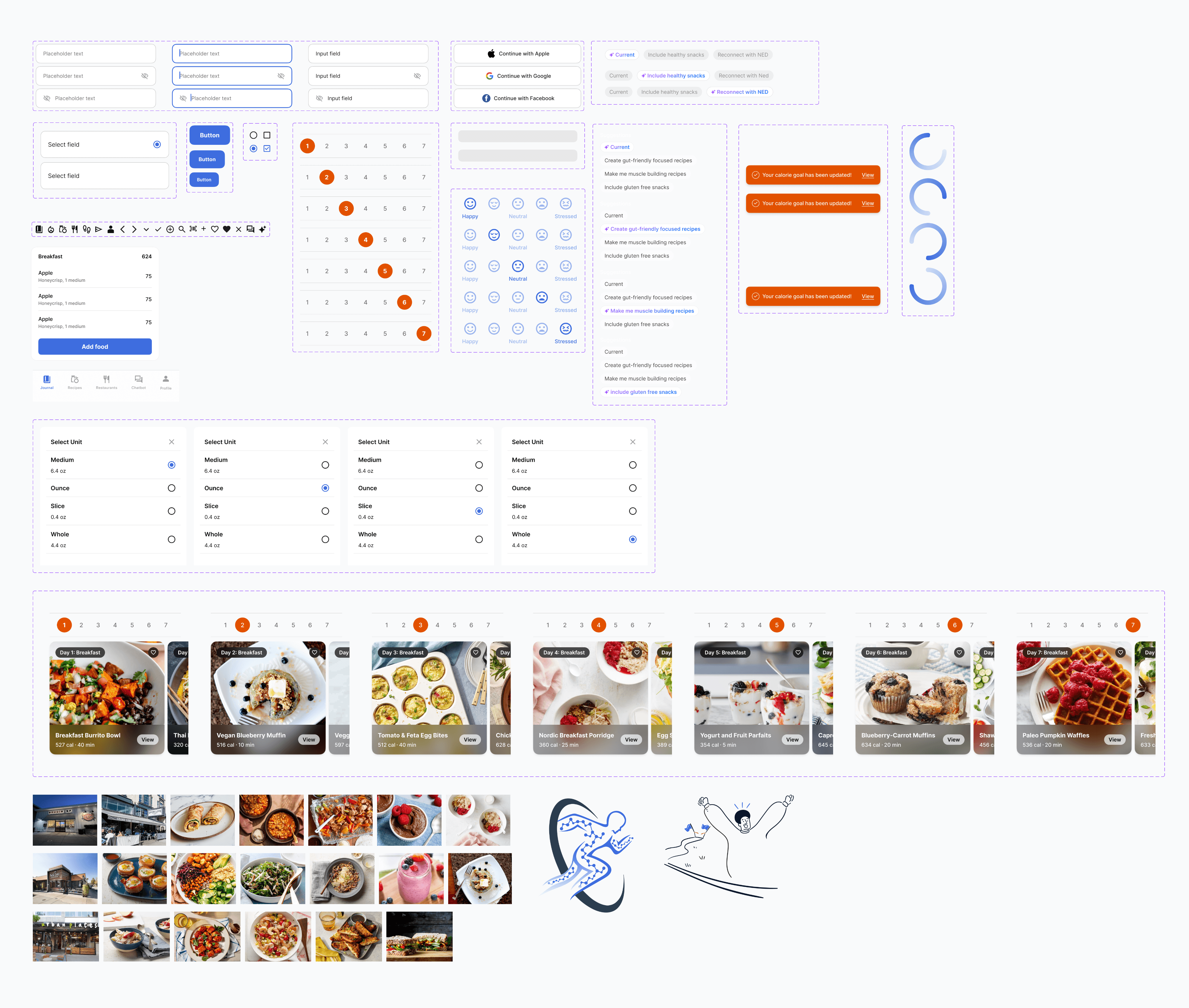 Organizing content in second stage to make sure every design decision feels purposeful and helpful to the user on each screen. My Initial wireframes starting from log-in, progress-tracking journal, curated recipes, diverse restaurant options, and a floating chatbot button which made the UI feel crowded. AI feature was underutilized which felt like a typical meal-logging tool.