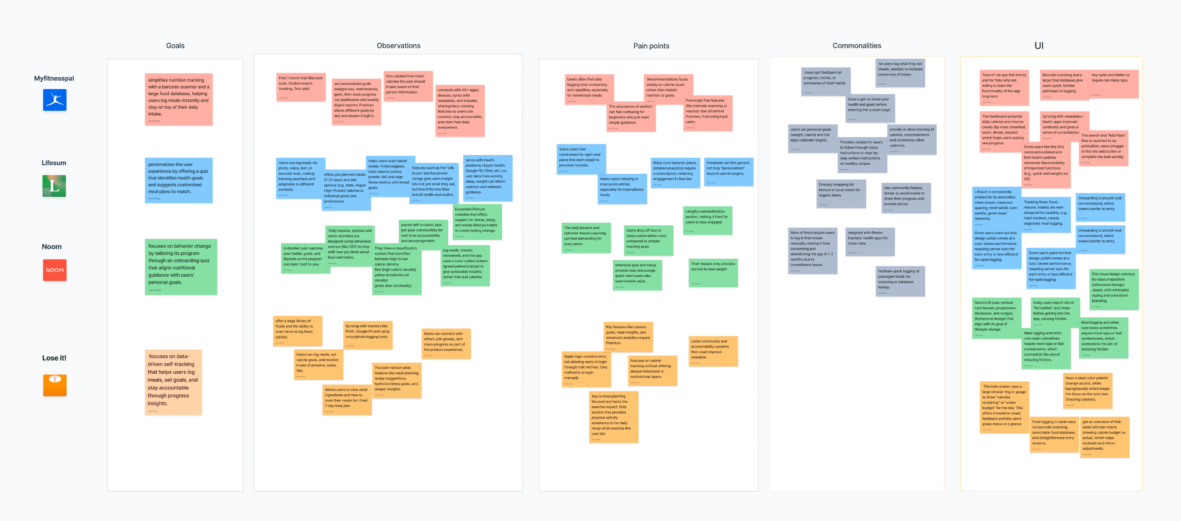 I created an affinity map created to analyze our 4 competitors and identify user behaviors, pain points, and design patterns to shape NutritionNest’s direction.