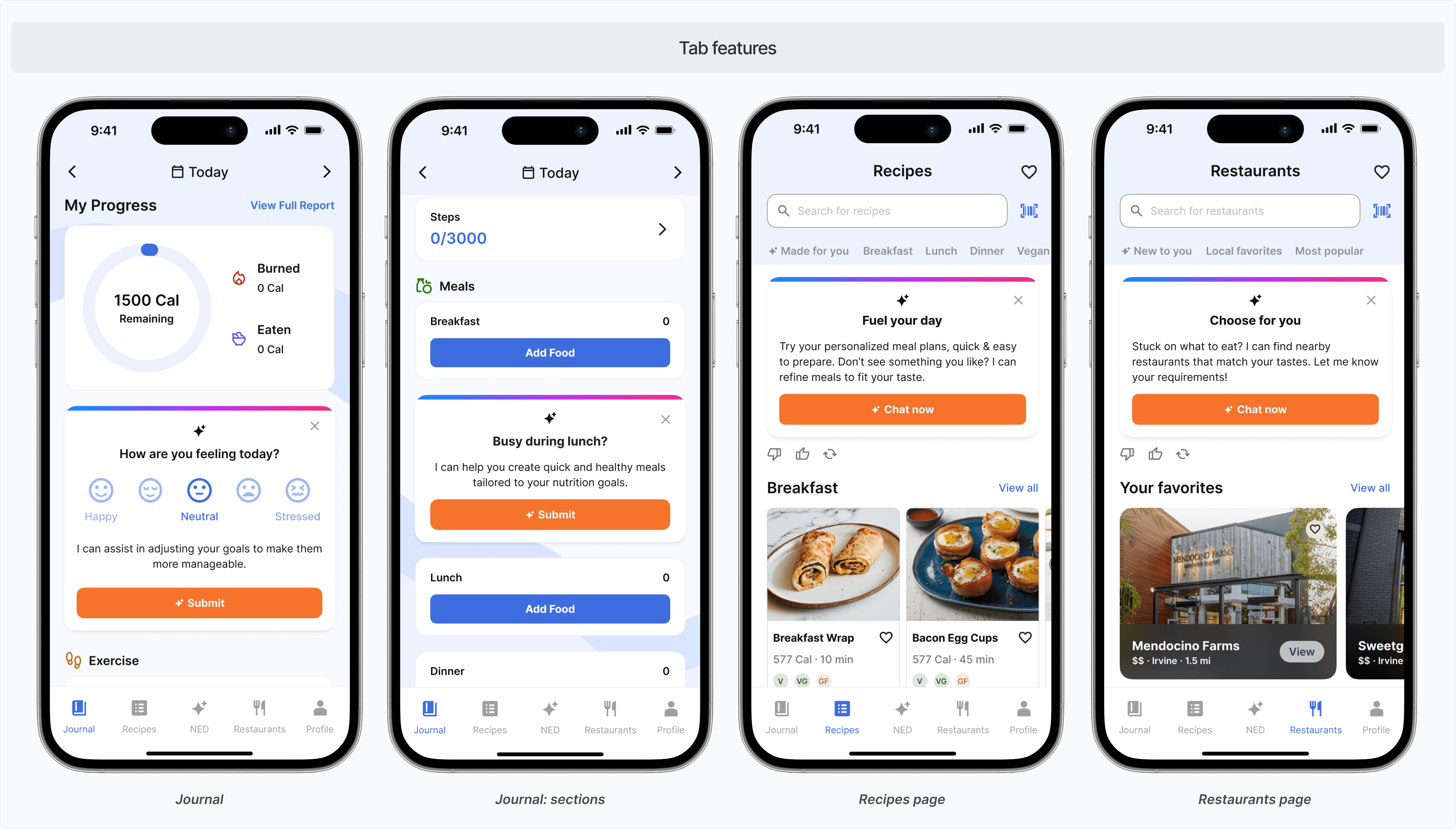 Here is the polished UI of journal, recipe, and restaurant tabs with dynamic NED cards, providing daily check-ins that create a personal support to drive accountability.